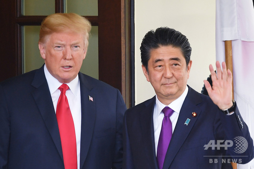 米首都ワシントンのホワイトハウスを訪れた安倍晋三首相(右)を出迎えるドナルド・トランプ大統領(2018年6月7日撮影、資料写真)。(c)AFP PHOTO / MANDEL NGAN