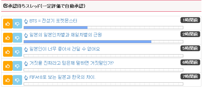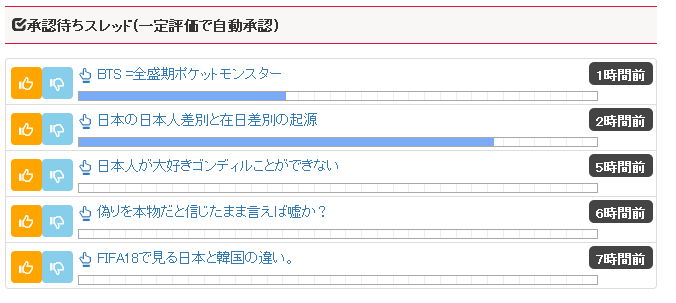 韓国人の糞スレしか承認できないって事だろ日本人、韓国人に限らず利用規約(禁止事項6.7)に反するのものは支持されないだろう。