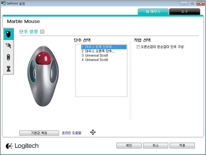 마지막이 됩니다만, 트랙볼의 마우스의 경우 스크롤 선택은 드라이브 설치를 한 후에, 가운테 버튼을 설정시켜 볼을 움직여서 화면을 움직이게 합니다.
