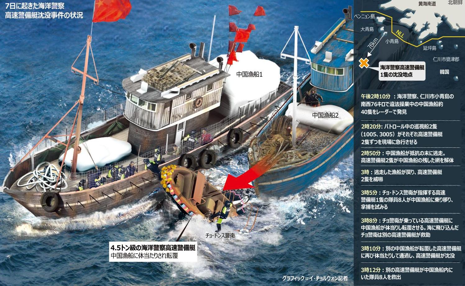 批判の発端となったのは、韓国北西部・仁川(インチョン)沖の韓国側の排他的経済水域(EEZ)内で7日、不法操業していた中国漁船が韓国海洋警備安全本部の高速船に体当たりし沈没させた事件だ。韓国政府は11日、中国の不法漁船にバルカン砲など重火器を使うことを容認。外務省は11日、邱国洪・駐韓中国大使を呼び、沈没事件について抗議した。