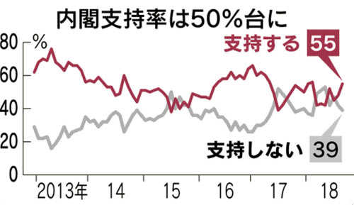 キチガイがどんなに死にもの狂いでネガキャンをやっても、安倍内閣支持率「55%」に回復