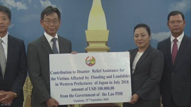 こうした中、日本の西日本豪雨の被災地に対し、ラオス政府から義援金10万ドル(日本円でおよそ1130万円)が贈られることになり、25日、首都ビエンチャンで、記念の式典が行われました。