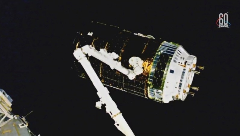日本の無人補給機「こうのとり」7号機が27日夜、国際宇宙ステーション(ISS)に到着した。写真はISSのロボットアームにキャッチされるこうのとり=NASATVより