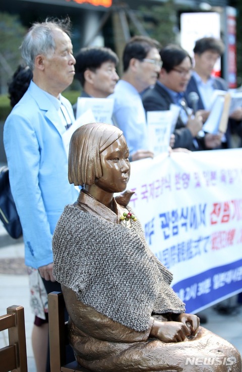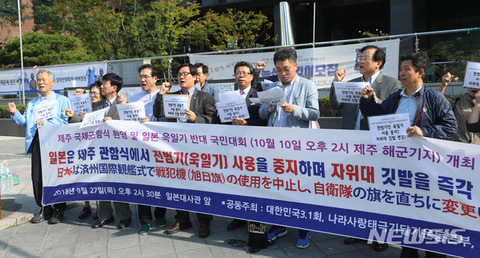 誰が全財産かけるんだよ。鮮民ネットワークのキム・ギュホ代表など大韓民国3.1会、国を愛する太極旗掲げる運動本部、鮮民ネットワークなど市民団体の会員たちが27日午後、ソウル鍾路区の旧駐韓日本大使官前で記者会見を開いて、済州国際観艦式参加日本軍艦の旭日旗使用中止及び自衛隊旗の変更を要求している。