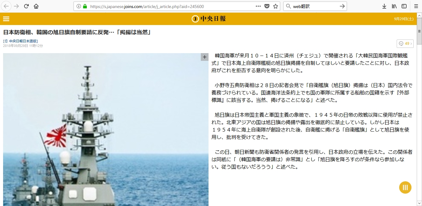 http://japanese.china.org.cn/jp/txt/2018-09/30/content_64403837.htmここで、騙されると慰安婦問題の河野談話と同じになってしまいます。慰安問題も旭日旗問題も、それまでは何も言ってなかったのに、戦後何十年も経っての【ある日から突然に】、人為的に作られて宣伝さるようになった問題です。もちろん「強制連行」も「戦犯旗」も嘘です。