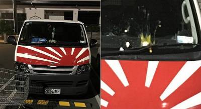 ニュージーランドのある駐車場で「落日旗」のデザインが施された車を見た韓国人がこれを「旭日旗」と勘違いして生卵を投げつける状況が起こった。 去る12日、あるオンライン・コミュニティには「ニュージーランドに住む韓国人が車両テロ」というタイトルの記事が上がってきた。 投稿には車の前面に戦犯期模様がラッピングされている自動車の写真と、当該車両の窓ガラスに生卵が投げつけられている写真2枚が含まれた。 著者は、「ニュージーランドに住んでいるある韓国人がスーパーで買い物をしている途中、トラックに旭日旗がラッピングされているのを見て頭にきて卵を投げた」と説明した