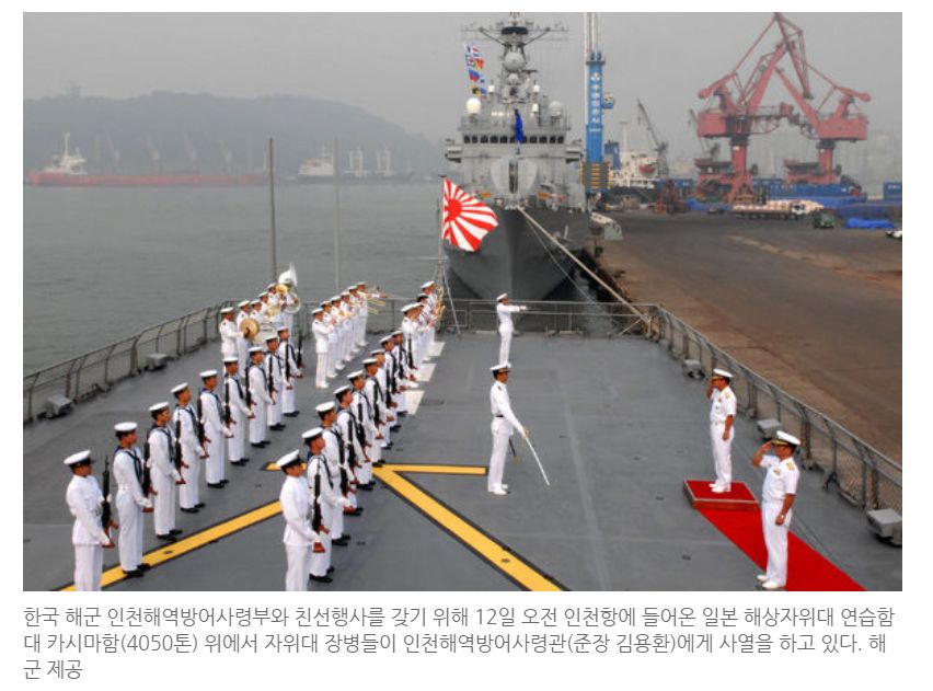 韓国海軍仁川海域防御司令部と親善行事を持つために、12日午前、仁川港に入ってきた日本の海上自衛隊の練習艦隊鹿島する(4050トン)の上、自衛隊の将兵たちが仁川海域の防衛司令官(准将キム・ヨンファン)に査閲をしている。海軍提供旭日旗を揚げた日本の海上自衛隊の船舶が、