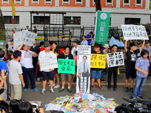 >高校生らが教育部(教育省、台北市)前で集会を開き、教科書などを積み上げて抗議を行った。