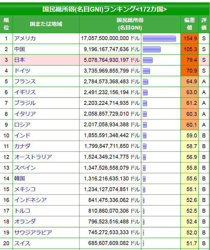 世界のGNPランキング 日本Sクラス 韓国Bクラス