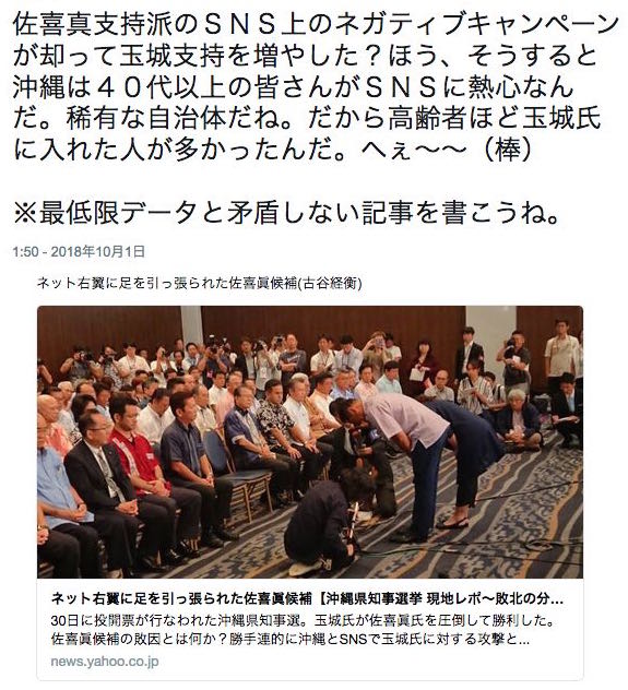 ネット右翼に足を引っ張られた佐喜眞氏【沖縄県知事選挙 敗北の分析】