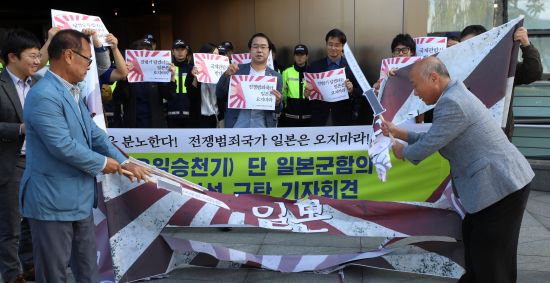 1日午後、鍾路区の日本大使館前で「戦争反対平和実現国民行動」が来月済州で開かれる国際観艦式に優勢期ただし、日本の軍艦が出席することを糾弾する記者会見をしている。