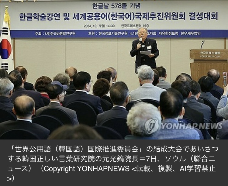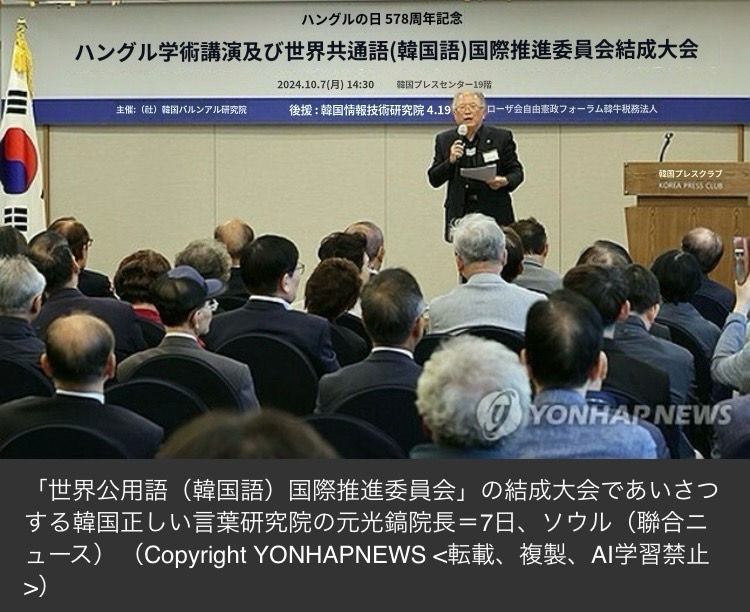 【ソウル聯合ニュース】韓国の社団法人、韓国正しい言葉研究院は7日、ハングルの制定を記念する祝日「ハングルの日」(10月9日)を迎え、韓国語を世界で広く使われる公用語とすることを目指す「世界公用語(韓国語)国際推進委員会」の結成大会をソウル市内で開催した。