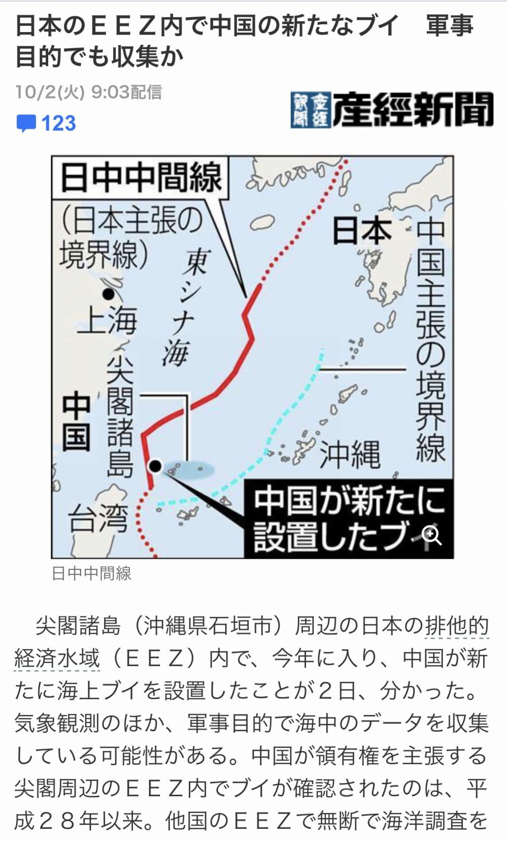 韓国は圏外というより中国やソ連と同様に敵国扱い・菅義偉官房長官は3日午前の記者会見で、中国が尖閣諸島(沖縄県石垣市)周辺の日本の排他的経済水域(EEZ)内で新たに海上ブイを設置したことについて「国連海洋法条約上、問題があり得る」と不快感を示し、外交ルートを通じ中国側に抗議したことを明らかにした。