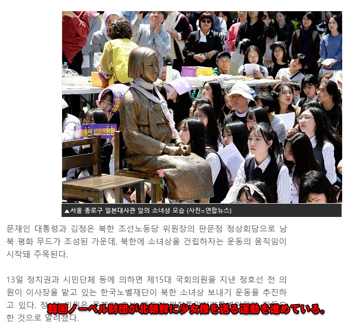 ここまでなら普通の団体のような気もするが、実はこの韓国ノーベル財団はノーベル賞に関する活動だけでなく、反日活動や北朝鮮に慰安婦少女像を建設する運動まで行っている。
