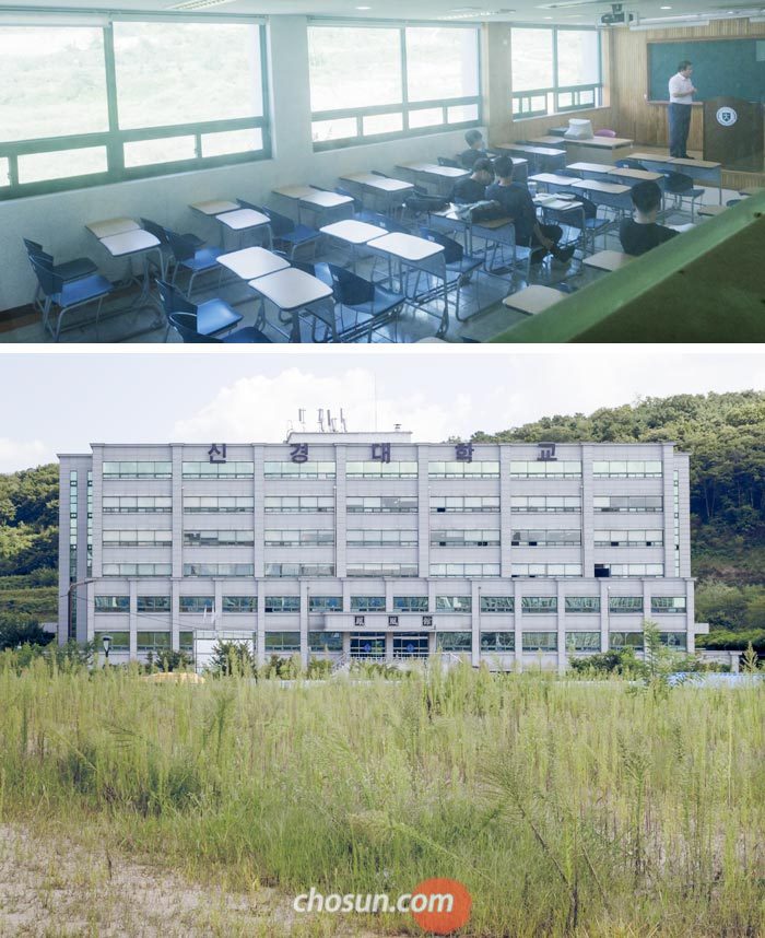 シンギョンデは今年教育部が行った「大学の基本能力の診断評価」(旧大学構造改革の評価)で最下位の評価を受けた11の大学の一つである。8つの学科、入学定員240人の超ミニ4年制大学である。11万㎡のキャンパスは5階建ての建物二軒、サッカー・バスケットボールコートなどがある。この日訪れたシンギョンデは閑散とした。建物の地下2階のレストランには、従業員に見える1人だけ座っていたし、建物の4階の定期刊行物、実は午後ロックあった。閲覧室では、学生4人が降りていた。閲覧室の雑誌のほとんどは、数年前に出版されたものだった。トイレにトイレットペーパーがない学生に理由を聞いてみると「給紙あれば汚れになると学校が撤去した」とした。