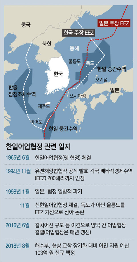 韓日漁業協定は、独島ではなく鬱陵島(ウルルンド)を韓国の領海の基線とし、締結当時から独島領有権問題の口実を与えたという批判を受けた。数年間交渉が決裂すると、一部の漁民は、「協定を破棄して再び締結せよ」と主張する。