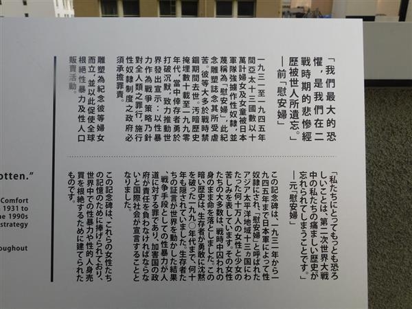この記念碑は、婉曲的表現で「慰安婦」と呼ばれる、実際には1931年から1945年までアジア太平洋の13カ国において日本帝国陸軍の性奴隷であった数十万の女性や少女の苦しみを証言するものです。性奴隷にされた女性や少女たちのほとんどが捕らわれの身のまま亡くなりました。この陰惨な歴史は、1990年代に生存者が勇気を持って声を上げるまで数十年間も隠しとおされてきました。
