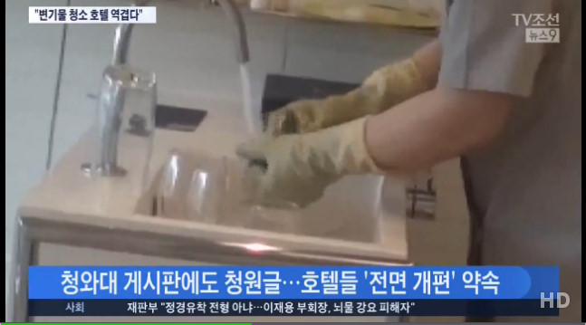 6日、「TV朝鮮」の報道によると、ソウルの5つ星ホテルでは、清掃をしに来た従業員は、たわしで便器の中の水を含ませた後、隅々まで拭く。そのたわしのまま洗剤をつけてカップを拭く。カップ水抜きは、宿泊客が使用した後、床に投げたタオルに仕上げている。
