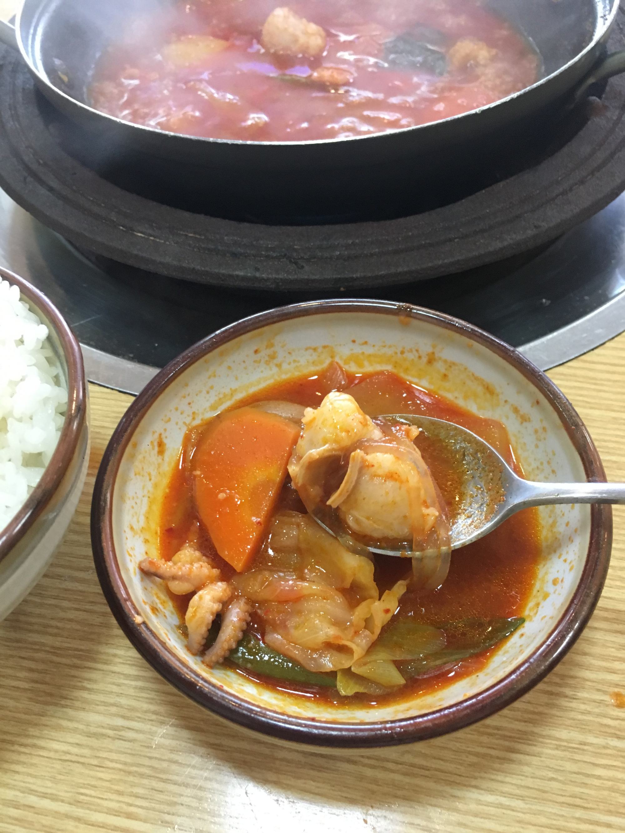 19전자인간337◆7rr6/tD0i62018/10/07(Sun) 23:41:20ID:AyMDczNg=(5/94)NG報告酒蔵巡りをしていたら韓国料理のお店を見つけ折角の機会なので入ってみました。『낙지 전골』?!タコの味噌鍋(ホルモン入り)を食べましたがとても美味しかったです。ちなみに西条から近い広島の三原という地域はタコで有名な場所ですので、新鮮な柔らかいタコが入っていました。店主のおばさんも気さくな方で、食べ方や料理の説明もしてくれて楽しい時間を過ごせましたよん♪>>20>>303