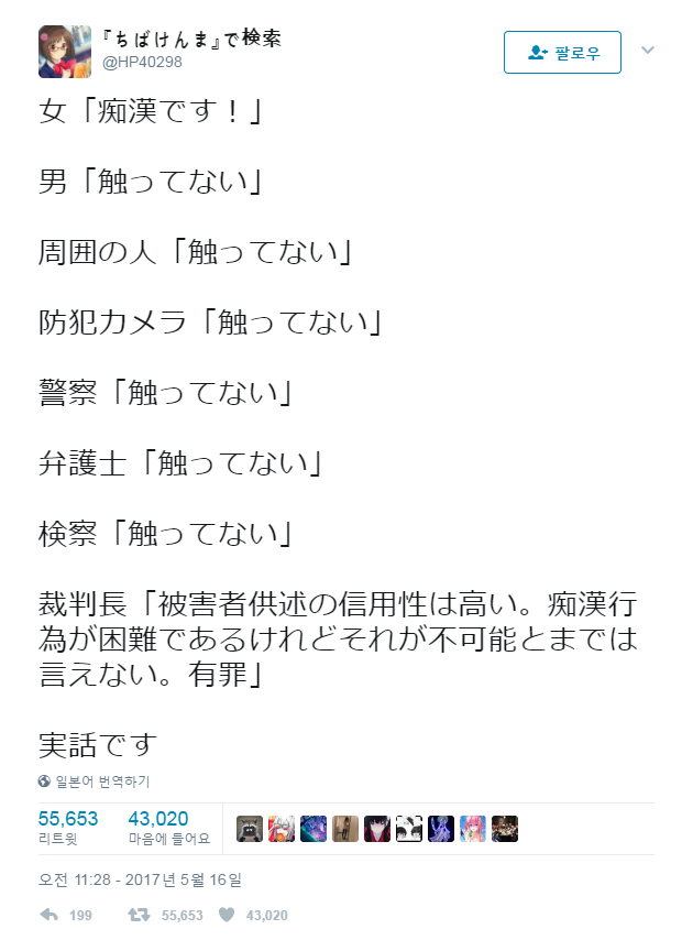 韓国一の市がそれなんだから、朝鮮人って面白いよな。재판장 쿠라사와 치이와는 "치한행위가 쉽지는 않았겠지만, 그게 불가능하다던가 매우 곤란하다고까지는 할 수 없다"며 유죄 판결을 내립니다.