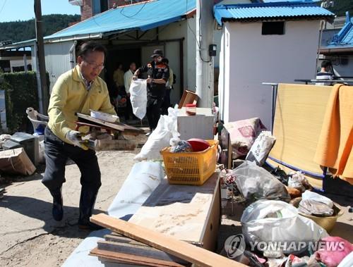 ギムブギョム行政安全部長官が7日、台風「豆レイ」で大きな被害を受けた慶北盈徳を見つけ被害住民を上にして回復に力を加えた。