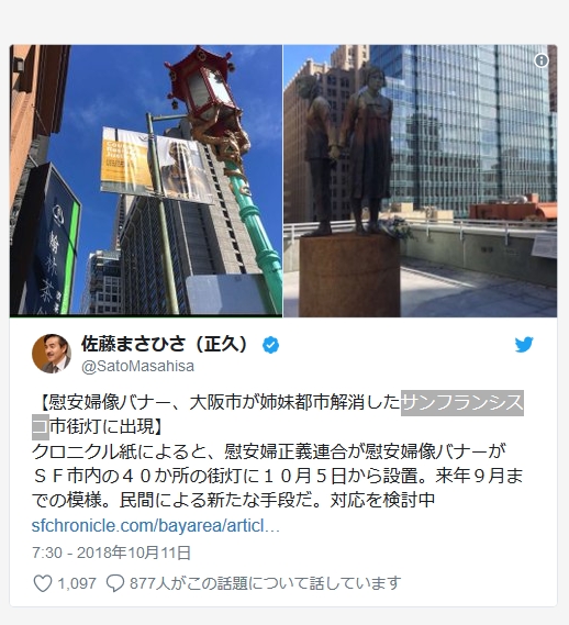 【慰安婦像バナー、大阪市が姉妹都市解消したサンフランシスコ市街灯に出現】 クロニクル紙によると、慰安婦正義連合が慰安婦像バナーがSF市内の40か所の街灯に10月5日から設置。来年9月までの模様。民間による新たな手段だ。対応を検討中