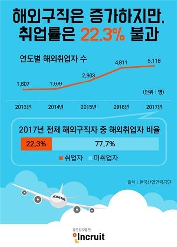 【ソウル聯合ニュース】海外に就職する韓国人が増えているものの、昨年、海外就職に成功した比率は22%にとどまったことが分かった。韓国の就職情報サイトのインクルートが11日までに、韓国産業人力公団の統計の分析結果を発表した。