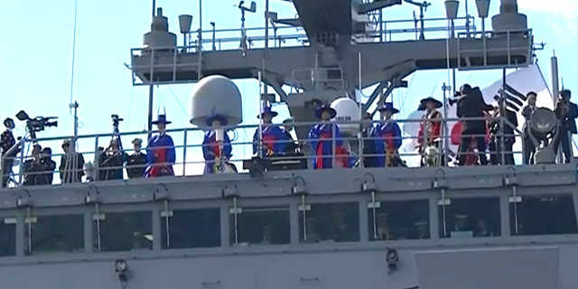 旗が長ければ「1」だ。この、日の丸(?)を掲げた、右側の船は、2番艦の『天子峰』じゃなく、1番艦の『天王峰』じゃないかな?。つまり、報道では、『文在寅は座乗艦の〝日出峰艦〟に乗船し、他のスタッフや、見学者は、試乗艦の〝独島艦〟と〝天子峰艦〟に乗船した。』ってなってるけど、〝天子峰艦〟を、1番艦の〝天王峰艦〟にすり替えたんじゃないかな?。つまり『〝天子〟は唯一、習近平様。日本の国家元首は、天〝皇〟ではなく、天〝王〟である。』をアピールする為に、『天王峰』にマストに、日の丸を掲げたんじゃなかいかな?(笑)。後ろからの映像だけだから、右側の艦が『天王峰艦』である!とは断言出来ないから、推測だけどね。