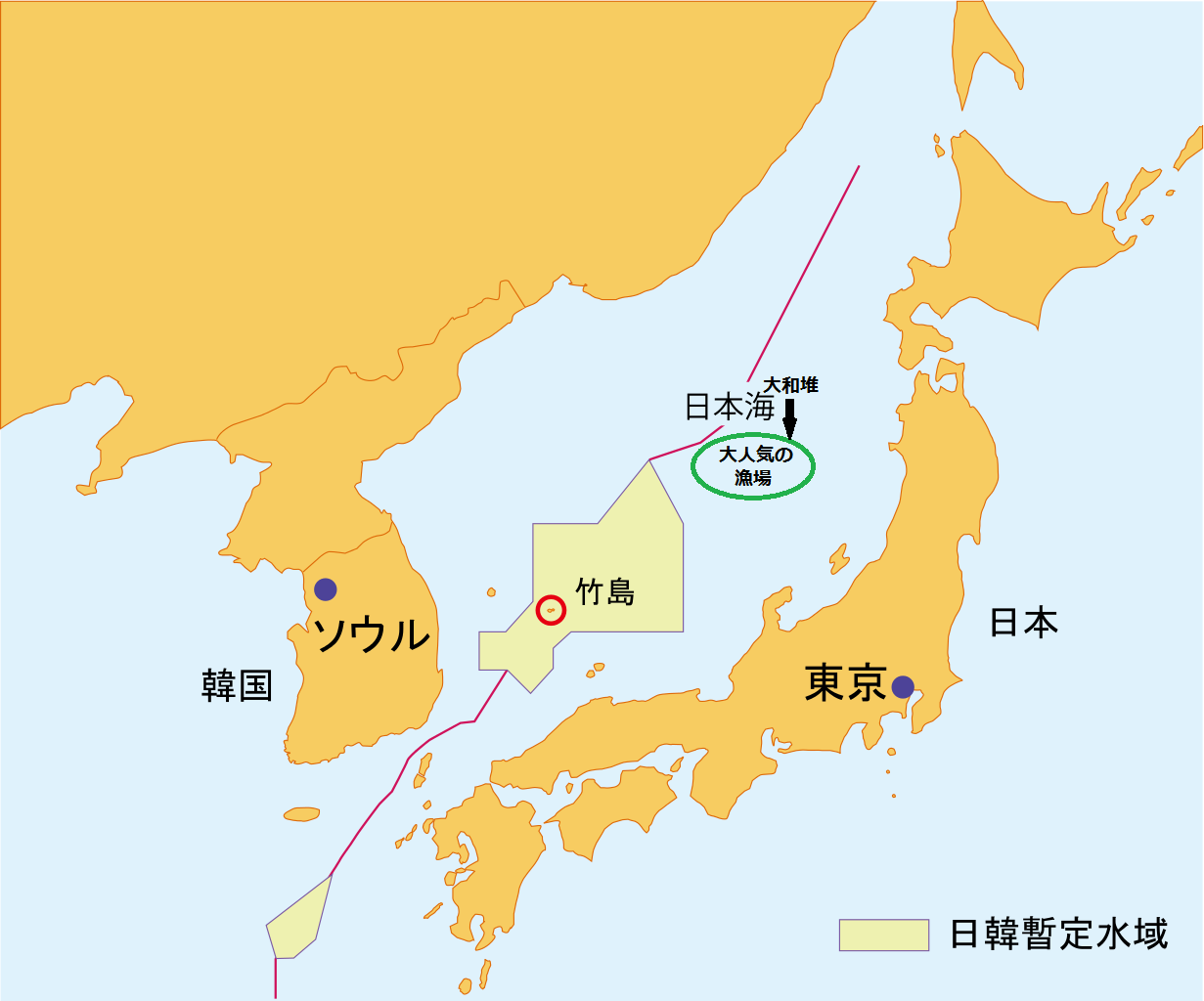 議題には上がっていないが暫定水域での漁法の問題もある(各々の国の法律を適用ってアホな条件になってるから、韓国はカニかご、定置網を設置してて、日本はトロール漁:底引き網ができない状態)