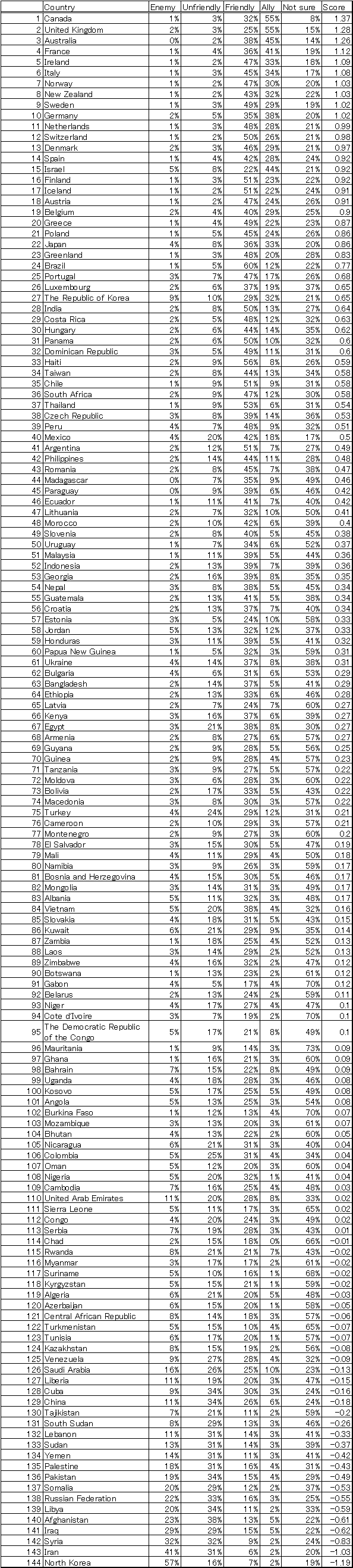 Country Enemy Unfriendly Friendly Ally Not sure
