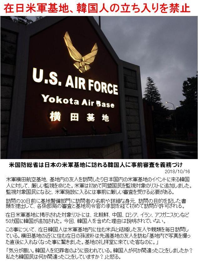今回、韓国人も海外米軍基地に立ち入ることを世界的に禁止にしただけですよ。韓国の米軍基地には日本人は?