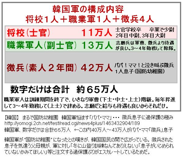 その階級な平均的な韓国軍人は基礎体力・運動能力・知能・知識・道徳……その他諸々で日本の高校生の底辺より劣っているのだから、仕方がないだろう。韓国軍の予算は潤沢ではなく、弾除けにも鳴子にもならない下っ端の給与に回す余力はない。韓国の軍事予算のほとんどは、給与とは別の形で「偉いお方」の懐に入るのだから。ネトウヨの愛国心はファッション愛国だからなぁ…