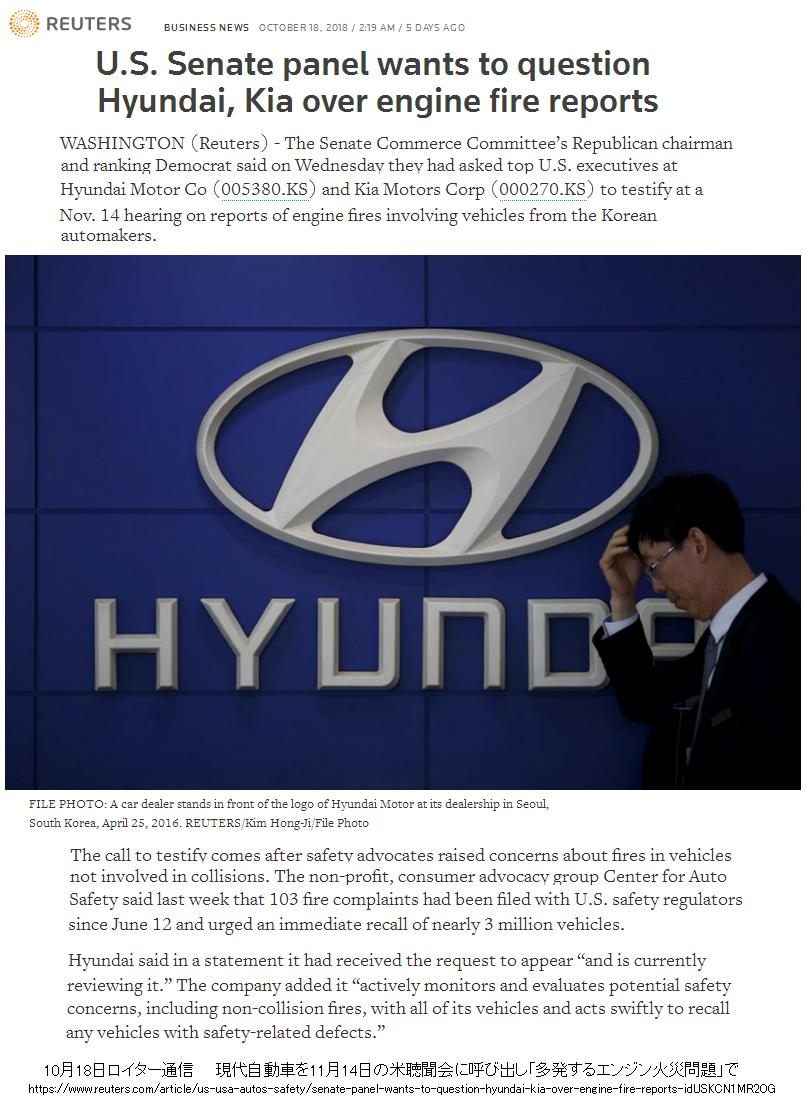【韓国】 米聴聞会に呼び出される現代自動車"多発するエンジン火災"問題 --2018/10/18