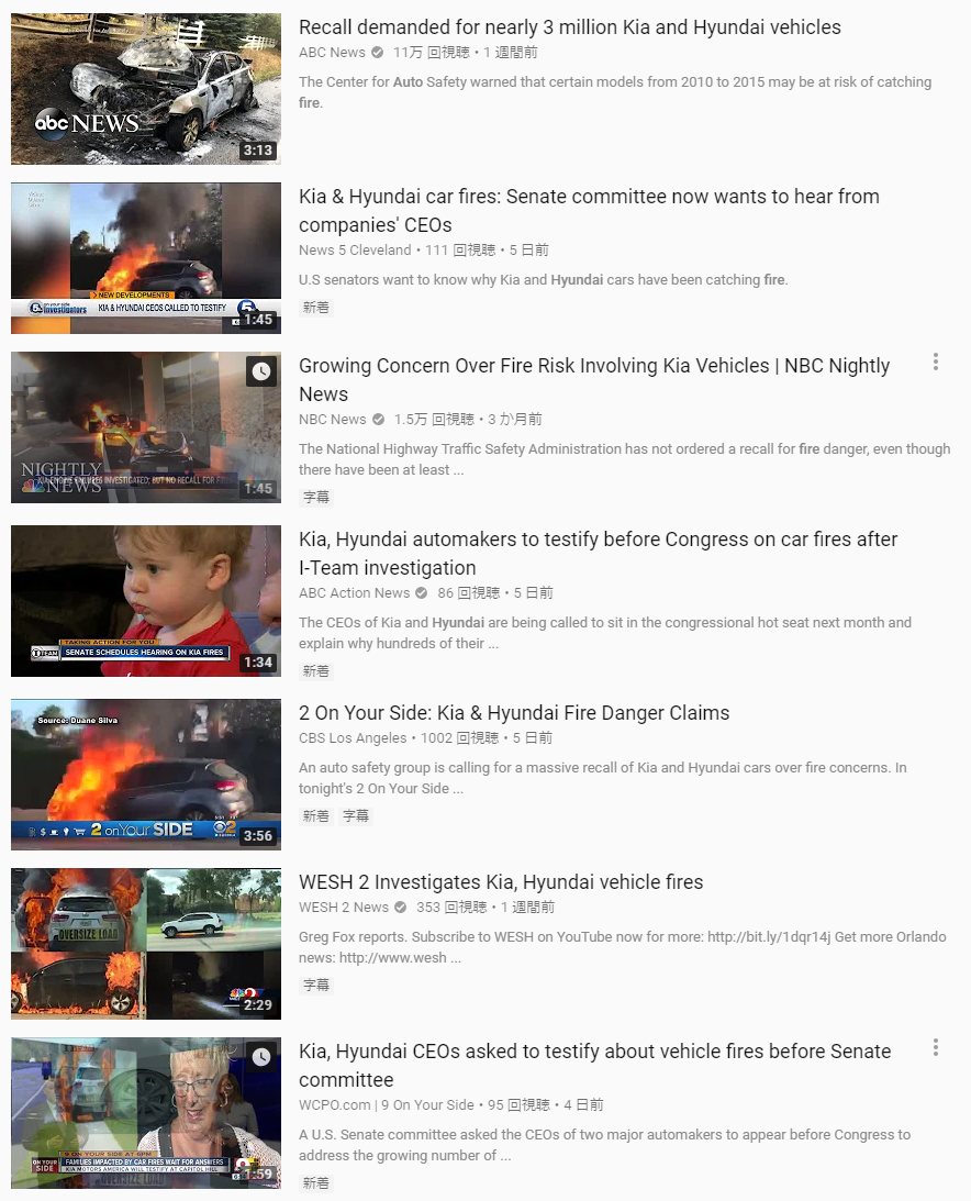 https://www.reuters.com/article/us-usa-autos-safety/senate-panel-wants-to-question-hyundai-kia-over-engine-fire-reports-idUSKCN1MR2OG米国で多発するヒュンダイとキア自動車のエンジン火災(動画) NBC News 2018/07/18