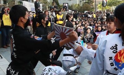 国際観艦式に併せて、ソウルでは自衛艦旗「旭日旗」を貼った板を、テコンドーを習う子供に蹴らすパフォーマンスがあった。公教育ではないが、まさに刷り込み教育だ。