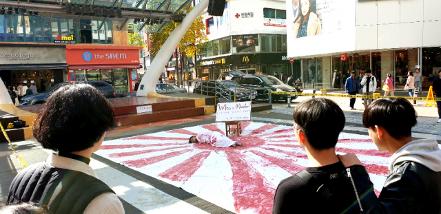 동성로 한복판 욱일기와 피 흘리는 여성…'욱일기 사용 반대 캠페인' 화제