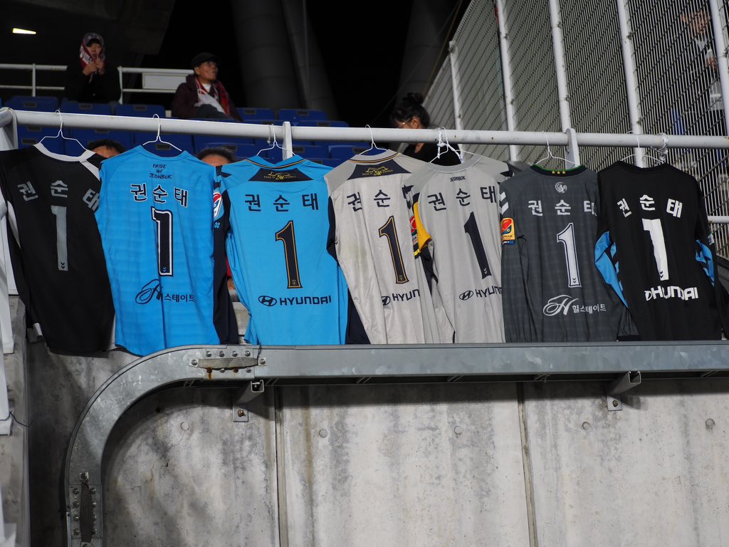 ↓鹿島VS水原戦で、スンテを応援する全北サポーターがスタンドにかけた、全北時代のユニフォーム>>1