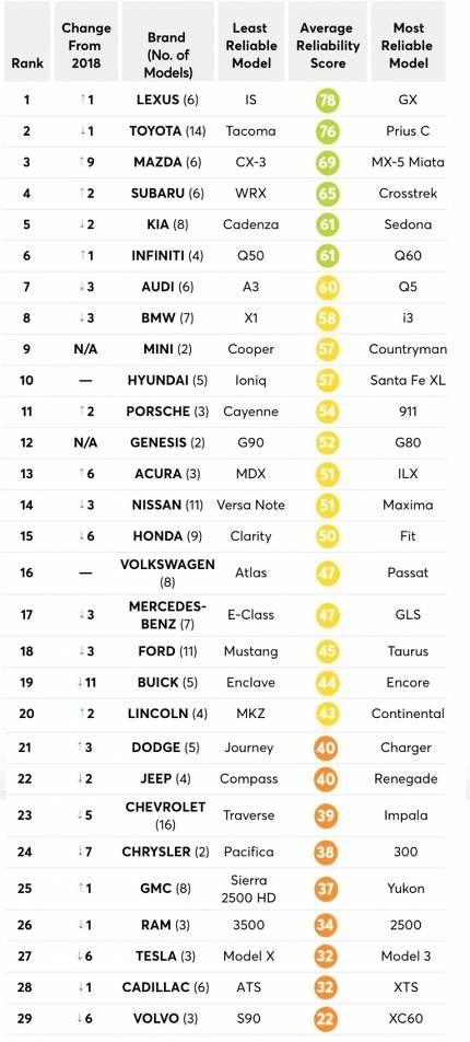 レクサスが米コンシューマーリポートの2019自動車消費者信頼度調査で6年連続1位になった。2位はトヨタ、3位はマツダ。4位はスバルで、日本ブランドがトップ4を占めた…(省略)
