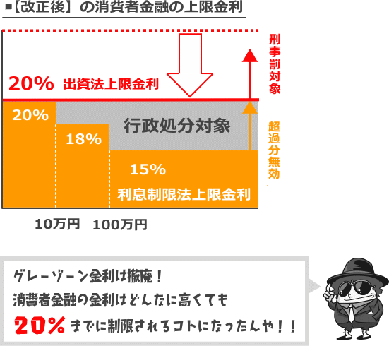 一例として、Aという顧客が、今年12月に現行の法定最高金利である年24%で融資を受けた最高金利が来年7月に開いた23%で、再来年7月に22%に低下した場合、Aの顧客の貸出金利もこれ合わせ23%、22%にダウンになる。