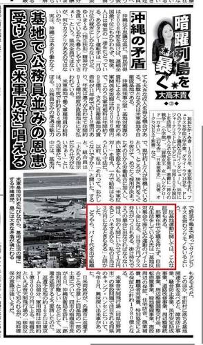 那覇在住で定職を持たず、自由な生活をしているA氏は「基地反対集会や座り込み運動のバイトはいい金になる。日当2万円プラス弁当がつく日もある。掛け持ちで2つの集会に出なければならない時は、別の人間にいかせて1万円をピンハネするから、私の日当は3万円になるときもある」と明かした。私は初期の拉致奪還デモには参加しましたがロート辺りから総会屋みたいなデモ始めてから離れました。