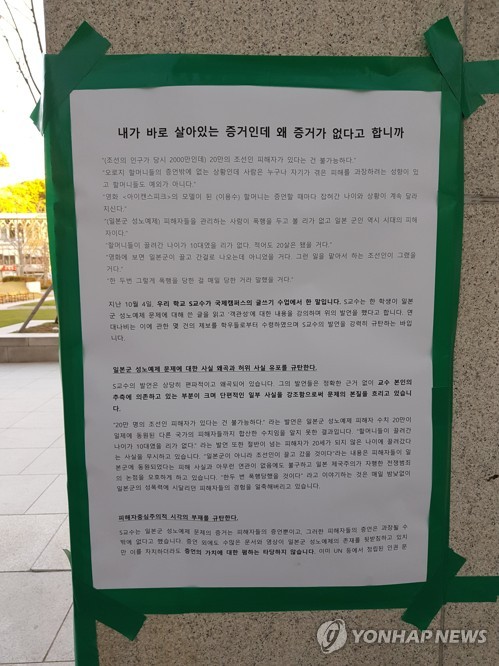 延世大の講師が授業途中、日本軍慰安婦被害者たちが被害を誇張したという趣旨で発言して、学生たちの反発を招いている。