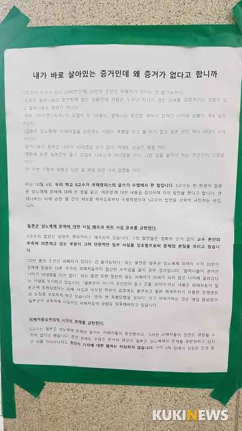 延世大の講師が授業中に日本軍慰安婦被害者が被害を誇張しているという旨の発言をして、学生たちが反発している。