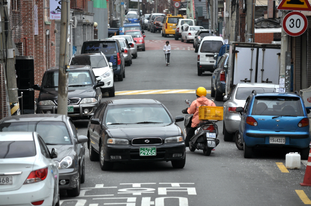 狭い道なのに右に左に違法駐車(韓国だから違法じゃないのかも)