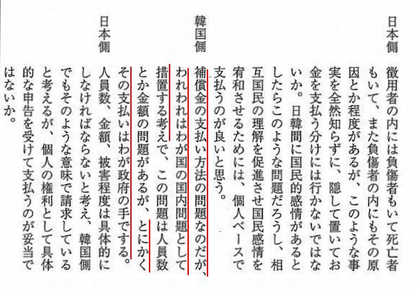 日本側: 徴用者の内には負傷者もいて死亡者もいて、また負傷者の内にもその原因と程度があるが、このような事実を全然知らずに、隠しておいて金を支払うわけには行かないではないか。日韓間に国民的感情があるとしたらこのような問題だろうし、相互国民の理解を促進させ国民感情を宥和させるためには、個人ベースで支払うのが良いと思う。