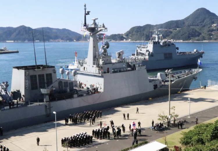 韓国海軍の駆逐艦と揚陸艦が5日、長崎県佐世保市の海上自衛隊佐世保基地に入港した。海自佐世保地方総監部によると、韓国側が海自に対して自衛艦旗である旭日旗の掲揚自粛を求めた問題以降、韓国海軍艦の来日は初めて。