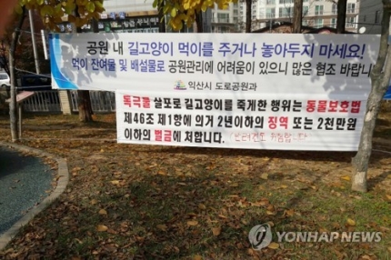 【写真】益山公園に付着したプラカード(益山=聯合ニュース)6日、全北益山市公園の「毒物散布に道猫を殺した行為は、動物保護法に処罰される」と書かれた横断幕がかかっている。