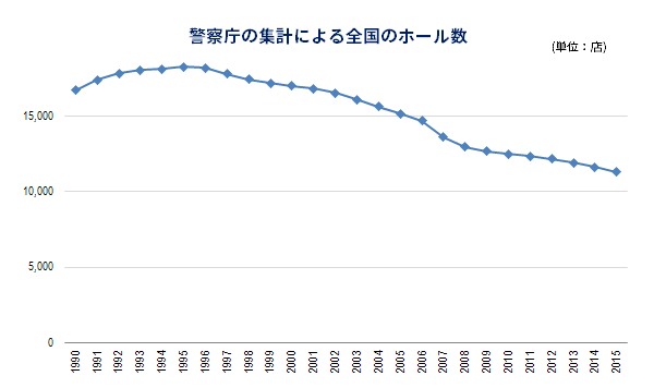 パチンコ・パチスロの遊技人口(レジャー白書)はピークの約3,000万人から1,000万人を割り込み、パチンコホール数(警察庁調べ)も2008年から2017年までの10年で18.0%減と、苦境が鮮明になっている。
