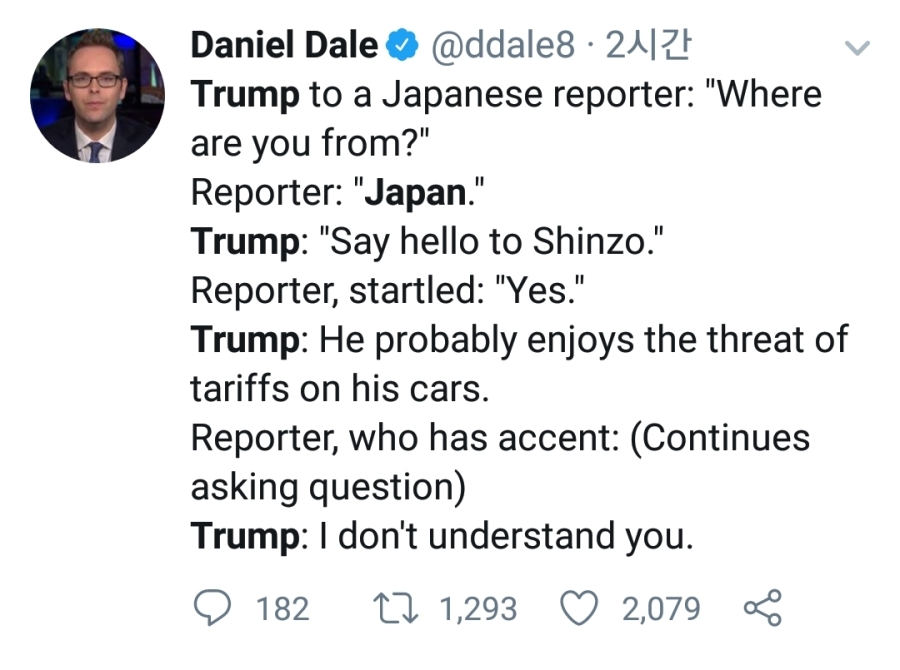 老人にも分かりやすい日本語にして下さい。なんだ、ReporterがSouth Koreaだったらトランプがなんて言うか聞いてみたかったわw