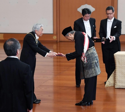 陛下にとって、今回が最後の大綬章親授式となり、経団連会長を務めた今井敬さん(88)、マレーシアのマハティール首相(93)らに、今回最高位となる「桐花大綬章」を、平沼赳夫元経済産業相(79)らに「旭日大綬章」が、直接手渡された。
