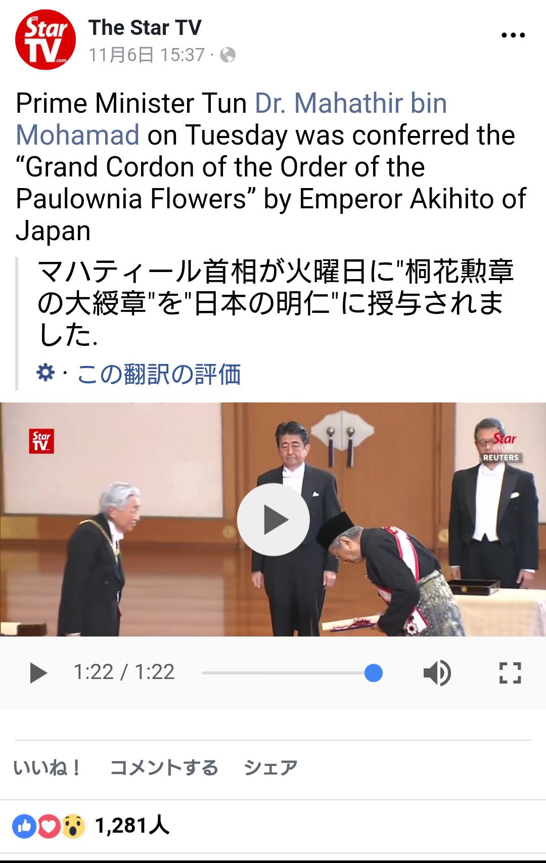 式に続き、陛下は、受章者や配偶者と面会し、「長年それぞれの務めに精励し、国や社会のために、また人々のために尽くされてきたことを、深く感謝しております」と祝福された。マハティール首相、受章おめでとう御座います。